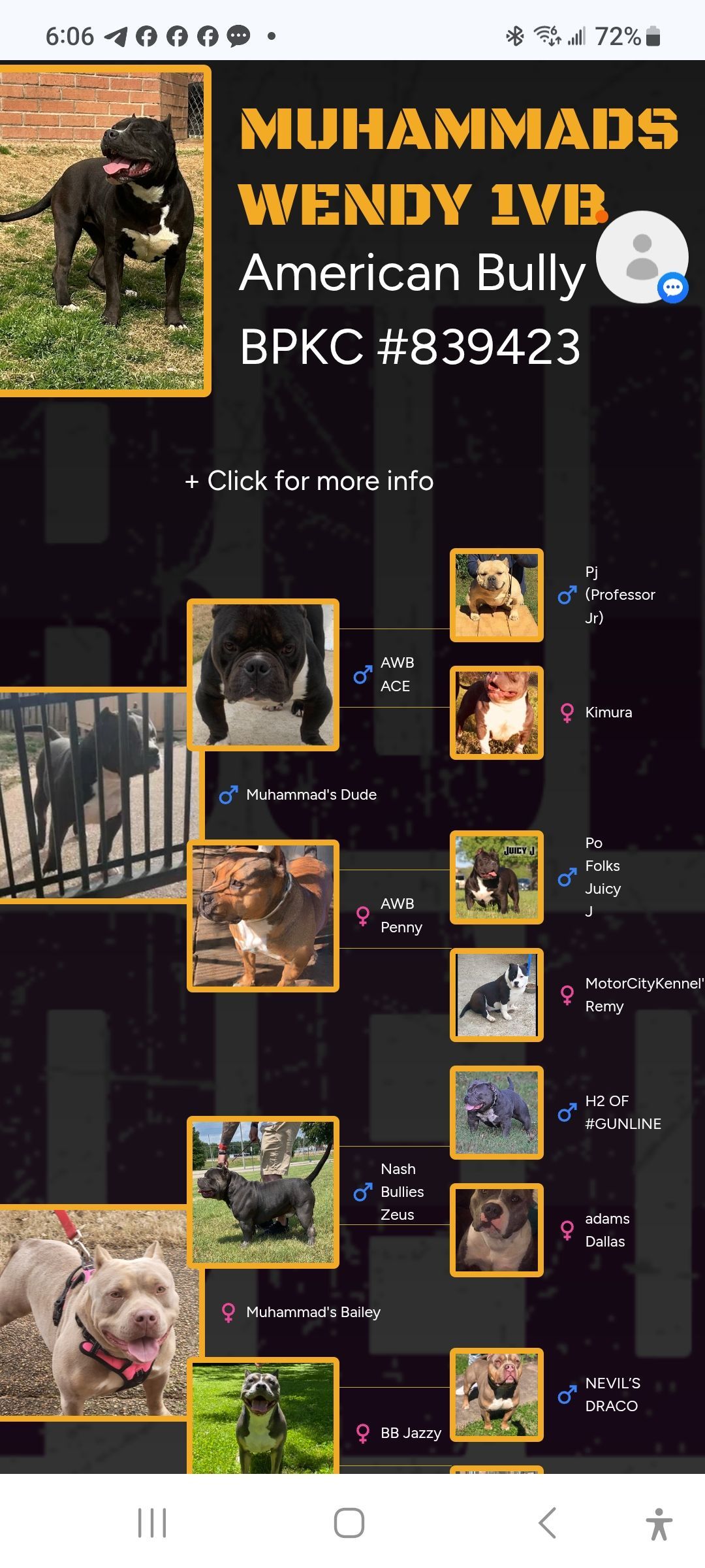 Greetings! My name is Wendy and I am an energetic Female American Bully. I am excited that you may get to be my new owner. I will soon be ready to produce my first litter of beautiful bullies for you.